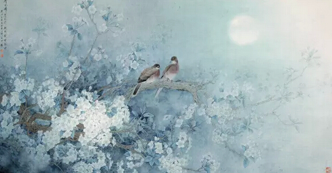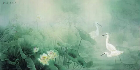 作画精于形则意味横生,然形生于色,色定基调也。色雅则画雅,色俗则画俗,满纸浓红艳绿,则无人能赏。余常涉江南水乡,览八百里洞庭、十里荷塘、武陵胜景、世外桃源,赏杏花春雨、黄鹂婉转、燕语呢喃、丝竹盈耳,宛若置身宋词意境,景色无不秀美清隽。遂借精工细丽的笔触,淡雅姝丽的色调,追古贤妙笔,怀古之情怀。源于此,余作画以清为秀,以秀为高,强调清秀静谧、古雅沉浑之格调。