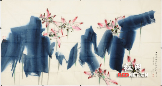 说起这幅新作的创作过程,湖南美术出版社社长告诉我们,“黄老为了这幅作品,一共画了三次。”社长回忆说,第一次画的是荷花,画完后黄老觉得背景不够透明,丢掉了;第二次画了一匹骏马,因为中途来了客人,终止了运笔,黄老还是不满意;第三次是黄老挑了一个安静的上午终于完成了?;旰?,黄老在画上庄重题下“日出东海上,月照洞庭波——湖南美术出版社惠存,黄永玉九十作于甲午”。