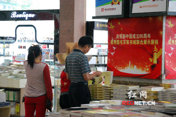 国庆长假期间,湖南新华书店延长了营业时间,以专台专柜的形式开展庆祝新中国成立65周年优秀图书联合展示展销活动,为祖国65周年华诞增添了一抹书香。